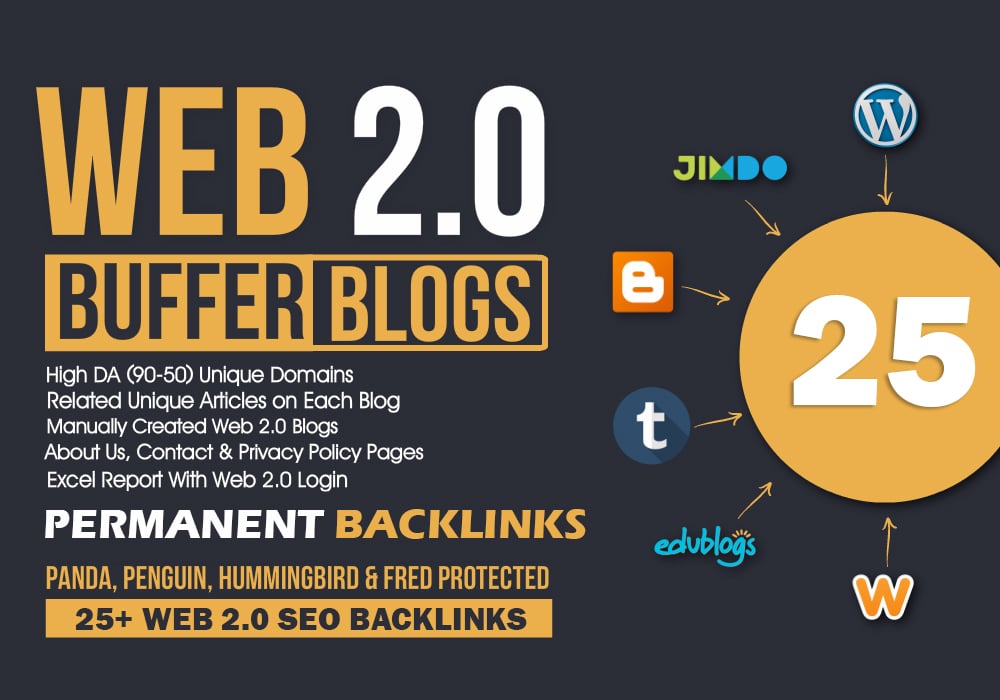 Looking for Powerful, Handmade Web 2.0 Backlinks to boost your SEO We provide 15 HighQuality Web 2.0 Blogs with full login details giving you complete control over your ...